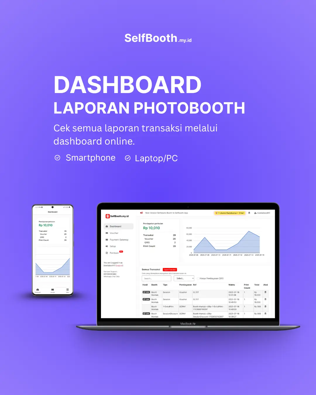 Pantau performa booth dari mana saja dengan dashboard berbasis web.