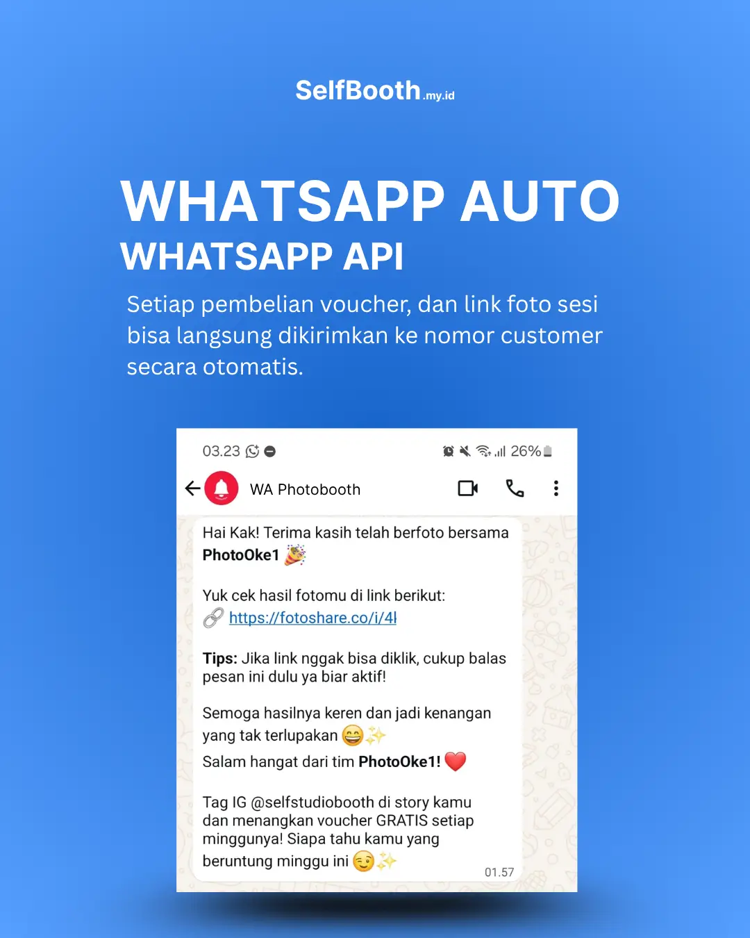 Otomatisasi pengiriman hasil foto langsung ke WhatsApp pelanggan.